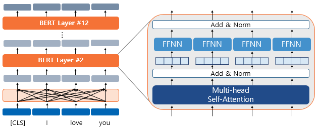 위 그림은 각 입력이 총 12개의 레이어를 지나는 모습과, 각 레이어의 세부 구성을 보여준다. 결론적으로는 각 토큰들은 12레이어를 지나면서 셀프 어텐션을 통해 문맥 정보를 담게 된다.